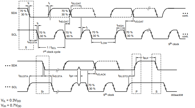 Because the I3C/I2C bus can connect to a variety of device technologies (CMOS, NMOS, bipolar), the logic '0' (low) and '1' (high) levels are not fixed but depend on the VDD level. VIL refers to the input low voltage, and VIH refers to the input high voltage. Typically, the input reference levels are set to: VIL = 0.3VDD, and VIH = 0.7VDD. Some older devices have fixed input levels of VIL = 1.5V and VIH = 3.0V, but all new devices require this specification to be 30%/70%.