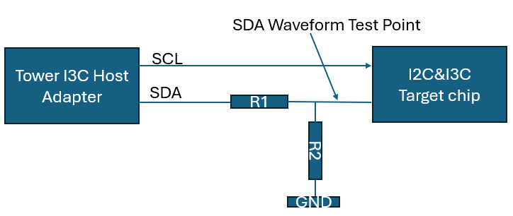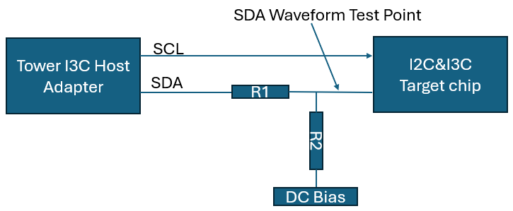 The first step is to connect the Tower I3C Host Adapter and the test chip as shown below, and add an adjustable resistor R1 and a fixed resistor R2 (1.5KΩ), and connect the DC Bias: